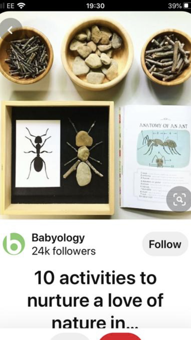 Can you collect some natural resources either from your garden or if you go on a little walk, things like leaves, stones, sticks, feathers, can you use them to make a 3D mini beast eg. An ant ( see photo ) using stones for his body and sticks for his legs or a spider, can you give him 8 legs?